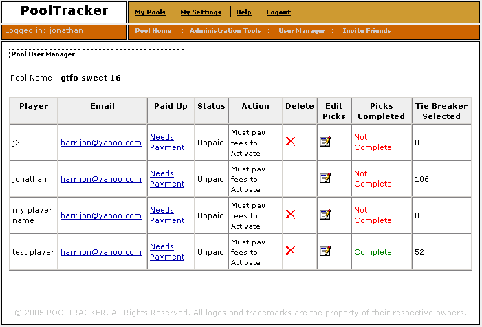 Allows the pool administrator to see everyone's progress in enterring their picks. Administrators can activate, inactivate and delete players and edit players' picks.